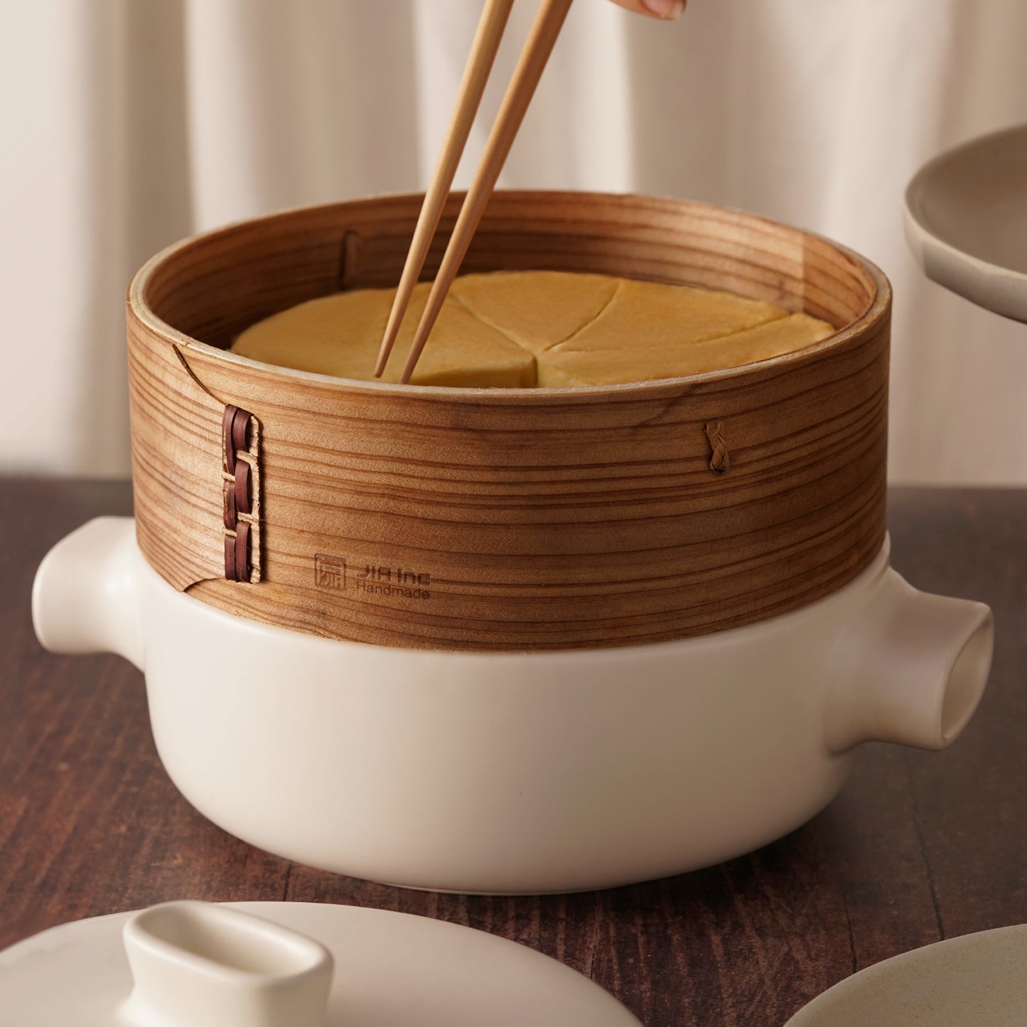 Los diseñadores han modernizado el vaporizador tradicional chino con un diseño elegante y funcional. La olla y la tapa están hechas de fibra ignífuga, que ofrece una resistencia térmica superior y se puede utilizar en cocinas de gas, hornos convencionales y microondas. La cesta del vaporizador, fabricada en cedro y con una base de tamiz de terracota, absorbe eficazmente el exceso de humedad, garantizando una cocción perfecta y sin resecar los alimentos.